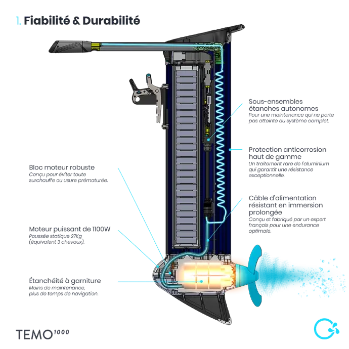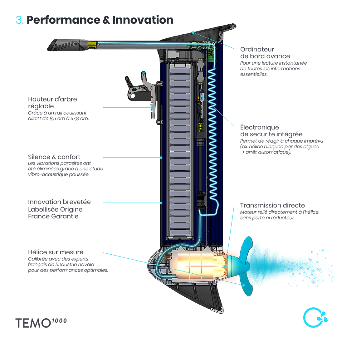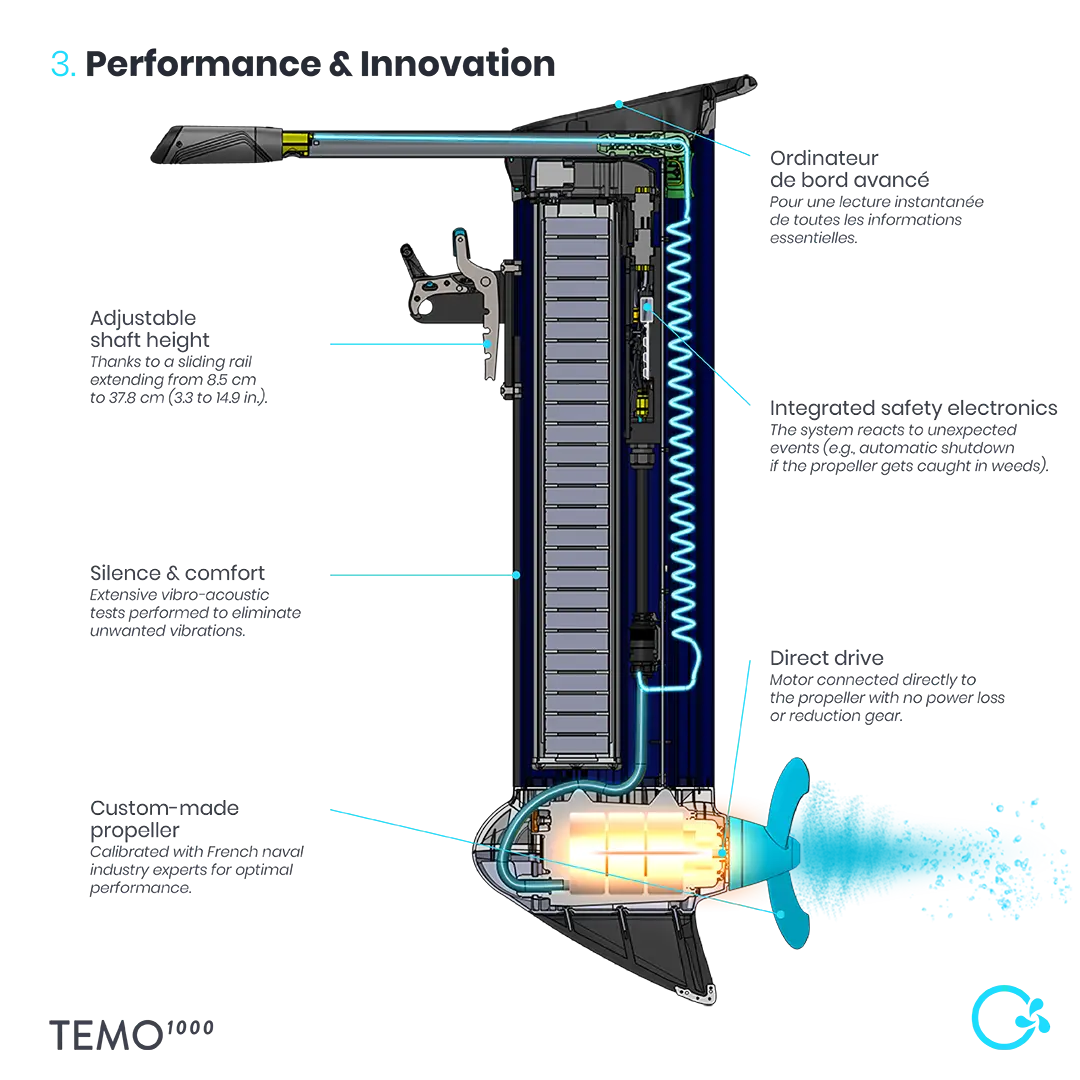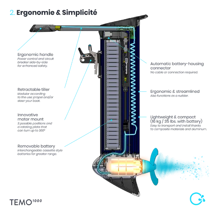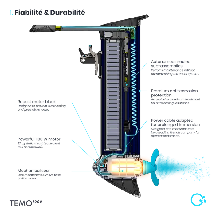 Cette même recherche de simplicité et de performance anime chaque innovation TEMO. Côté hors-bord, le TEMO·1000 - comme le TEMO·450 - s’installe en moins de deux minutes et bénéficie d’une conception ergonomique, durable et innovante. Chaque pièce est accessible et remplaçable, pour une forte réparabilité et une longévité assurée.